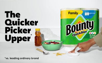 Spilled your drink? Quick! The Quicker Picker Upper. Be ready to tackle messes and spills with Bounty Paper Towels! Each sheet is 2x more absorbent, so you can use less and pick up spills and messes quicker than the leading ordinary brand. That’s why Bounty is the Quicker Picker Upper!